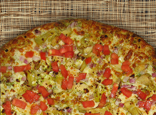 White garlic sauce, fresh mushrooms, red onions, black olives, basil, oregano, Parmesan cheese, artichoke hearts, fresh cut green onions & fresh tomatoes.