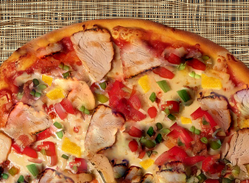BBQ sauce, grilled chicken, bacon, pineapple, red & green bell peppers, red onions & fresh tomatoes