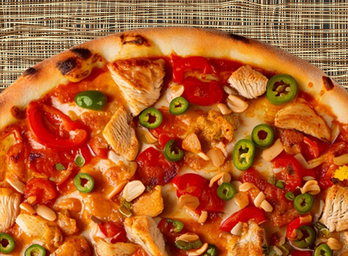 Spicy peanut sauce with a combination of grilled chicken, red & green bell peppers & red onions
